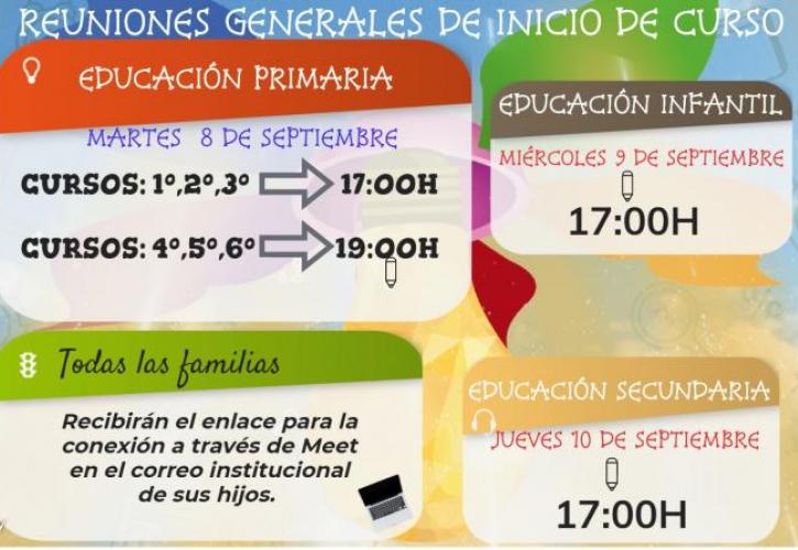 Para una correcta celebración de las habituales reuniones generales del comienzo de curso, cada familia recibirá en el correo institucional de sus hijos el enlace para la conexión.